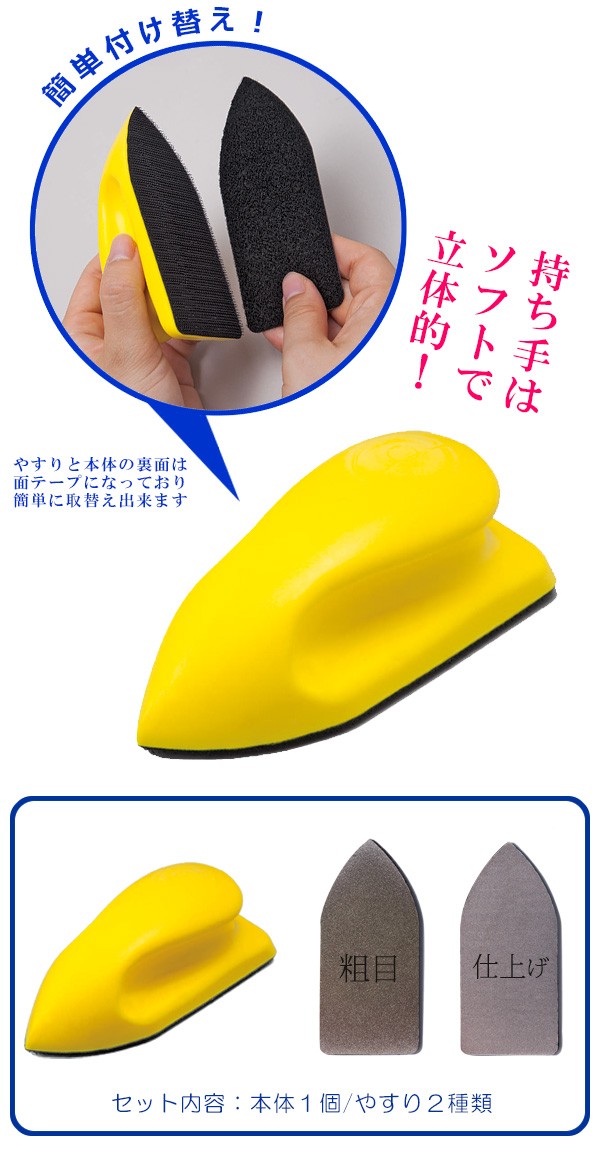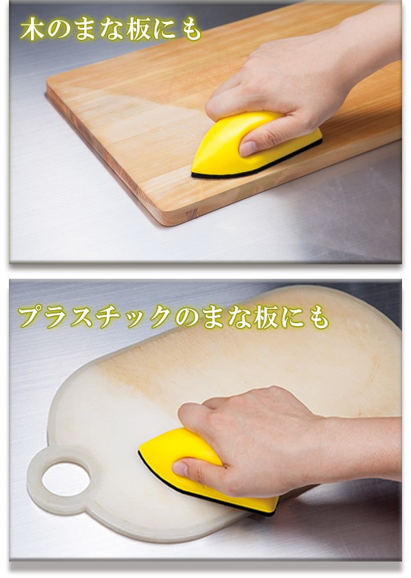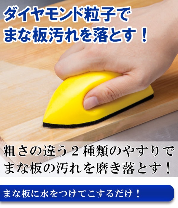 | 粗さの違う2種類のダイヤモンド粒子のやすりでまな板汚れを落としましょう!粗い方でまな板の汚れや傷を削り、細かい方でつるつるに整えます。持ち手は手にフィットする持ちやすい立体形状!やすり部分はマジックテープで付け替え可能! |