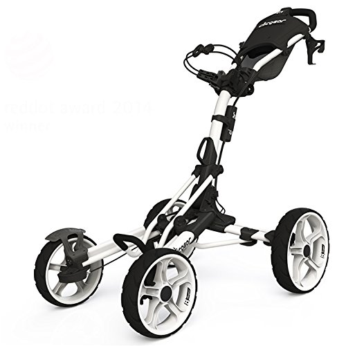 2014 brings the exciting new cart introduction from Clicgear, the Model 8. Available in April, the Model 8 is Clicgear's first 4-wheel cart design and quite simply the most advanced 4-wheel cart in the industry. The Model 8.0 features the new and patented 4XFOLD technology that allows all four wheels to fold, making for a much smaller folded size. This technology also allows the front wheels open wider as well, for greater stability. The Model 8 is the first 4-wheel cart to feature a front brake, incorporating a unique dual-brake design. One easy pull of the brake handle activates both front brakes. The dual front brakes allow for the cart to be quickly maneuvered around the green with the brake on. The Dual front wheel alignment makes this the first four wheel cart that can be adjusted to track straight. Each wheel can be adjusted independently.Feature