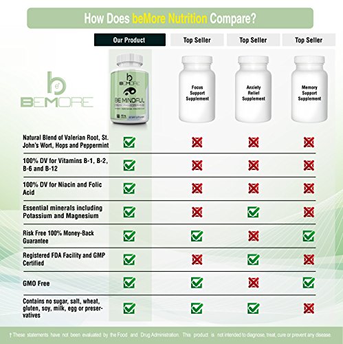 -. Title : beMore BE MINDFUL | For Optimum Brain Health that Keeps You Alert and Calm | Boosts Mood, Memory, Focus and Energy plus Anxiety and Stress Relief from Valerian, Hops, St John’s Wort & More