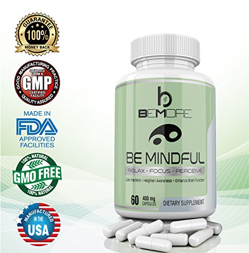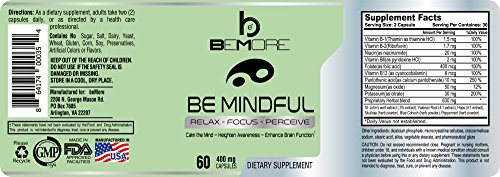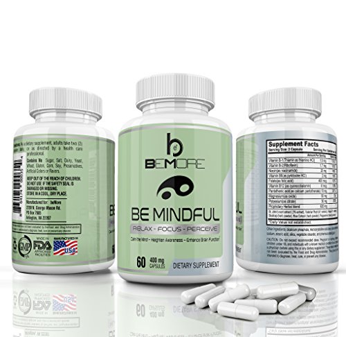 -. Feature : CALM THE MIND & SHARPEN YOUR FOCUS | Unlike overP.R.Iced supplements like Focus Factor or Prevagen, our one-of-a-kind BE MINDFUL formula delivers natural stress and anxiety relief with the best memory improvement, mood boosting and focus enhancing ingredients for optimum brain health and mental performance that relax the mind and body while keeping you alert and in the present so you can manage your hectic life. / A UNIQUE AND NATURAL NOOTROPIC | We formulated our unique BE MINDFUL complex to not only help you relax and calm your mind but also promote improved memory and optimal cognitive brain function. Unlike anti-depressants, anxiety medications or stimulants our natural brain health remedy provides a combination of essential ' brain food ' vitamins and natural herbal supplements meant to increase oxygen circulation in the brain and energize brain cells and neurons to boost your memory power. / RELAXED STATE OF ALERTNESS | Whether you are overwhelmed at work, stressed at home or busy with school, BE MINDFUL will help you truly "be there" and engaged in the moments that deserve your complete focus and attention. BE MINDFUL delivers the comfortable feeling of a weighted blanket from the inside-out for a relaxed state of inner natural calm, relieving stress and anxiety while keeping you alert with an energy + memory booster complex that enhances cognitive performance and concentration. / FEED YOUR MIND AND MOOD | Our formula delivers the most complete brain health and mood boosting complex available with all-natural ingredients and micro-nutrients shown to help the natural production of dopamine and serotonin including essential vitamins and minerals plus herbal extracts like St. John's Wort, Valerian Root, Hops, Skullcap, Blue Cohosh and Peppermint. / 100% MONEY-BACK GUARANTEE | We are so confident that you will love BE MINDFUL, that we'll refund every penny if you don't like it - even if you return empty bottles! What do you have to lose?