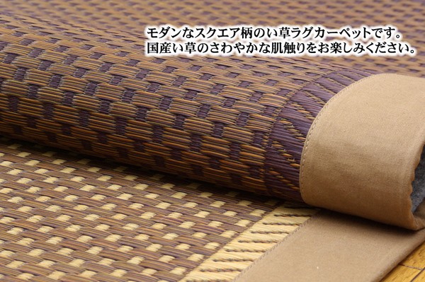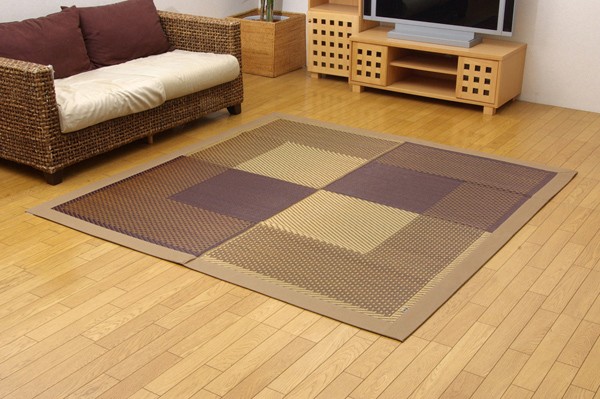 モダンな市松柄のい草カーペットです。国産(九州産)のい草を使用しています。一本一本が太く、表皮が厚く繊維がキメ細かいので弾力性があり、耐久性に優れています。い草には空気の自然浄化作用、湿度の調節作用などがあります。また汚れにくく、使用するうちに黄金色に変化し味が出ます。フローリングを傷つけにくいよう、裏には不織布を貼っています。い草に青森ヒバ加工を施しています。(抗菌、防臭効果)