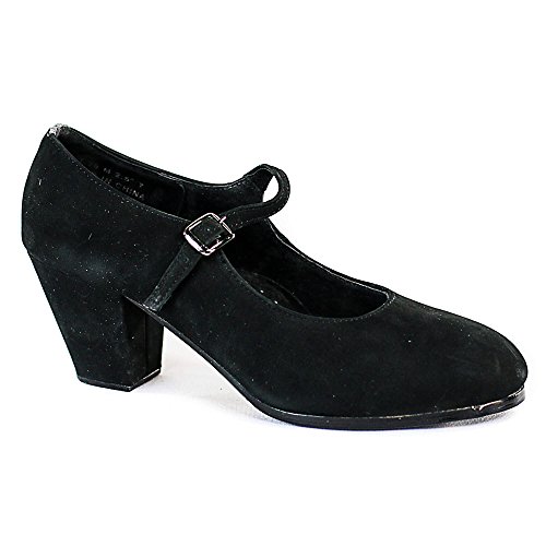 Product DescriptionTraditional Flamenco Shoe in suede with a buckle strap and reinforced stitching. Variegated rubber sole with nails on toe tip and heel. Designed for strenuous demands of Spanish dancing.0