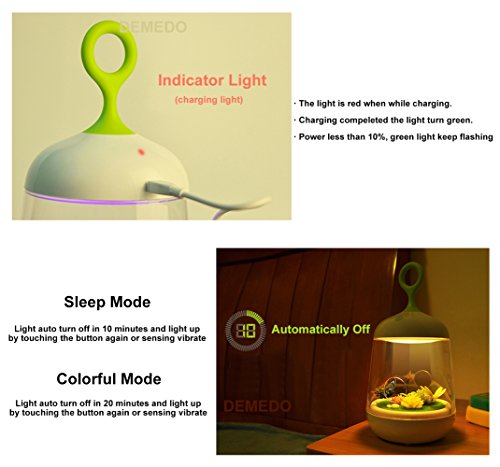 Q: How does it work? A: There are 2 mode of the night light. [Sleep Mode] is the soft yellow light. First touch the button to turn on the light, second time the light weakened by 50%, and the third press will off the light. [Colorful Mode] has multi-color light and it change every seconds. Press the button more than 1 second to turn on this mode. If you want to lock the current color, just vibrate it. Vibrate again to continue the colorful mode. Press the button more than 1 second again to turn off the colorful mode.