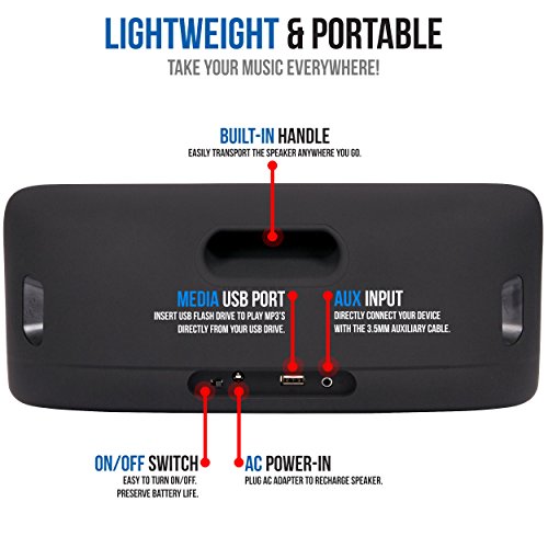 -. Feature : LATEST BLUETOOTH 4.0 TECHNOLOGY: Provides stutter-free music streaming and seamless high quality audio. Quickly pairs within seconds with a wireless range of up to 30 feet. Enjoy high quality acoustic sound with precision enhanced bass. / COMPACT & LIGHTWEIGHT: Futuristic style mini stereo boombox offers 6-watts of powerful sound and conveniently fits on the palm of your hands. Suitable for indoor and outdoor activities like the bedroom, backyard, kitchen, poolside, beach, camping, BBQ's and more. / INTUITIVE DESIGN: Simple physical-touch buttons allows you to easily increase the volume, switch between tracks, pause/play music or answer/hang up phone calls. An on/off switch is located in the back of the device to save battery power. / UP TO 10-12+ HOURS OF PLAYBACK TIME: Built-in rechargeable lithium ion battery provides long-lasting, quick charging power and 720 hours of standby time on Bluetooth. / UNIVERSAL COMPATIBILITY: Compatible with a wide range of electronic media devices such as Apple iPhone 6S/6 Plus, 6S/6, 5S/5C, 4S, iPads, iPods, iMac, Macbooks, Samsung Galaxy S Series, Galaxy Note Series, Google Nexus, Motorola Droid, HTC One, LG V10 G4, Sony Xperia, Nokia Lumia, Tablets, Laptops, Smart TVs & PC Desktop Computers (PC Compatibility May Vary). 3.5mm aux-in to connect directly to any non-Bluetooth device to still enjoy your favorite music, tv shows or podcasts.