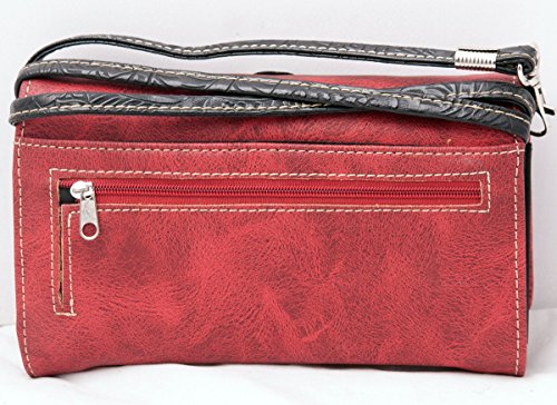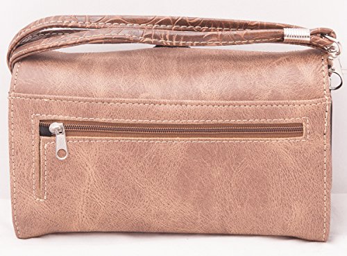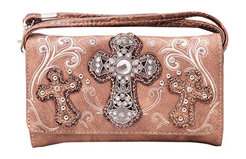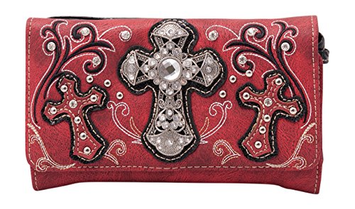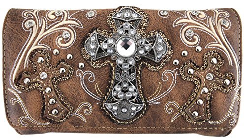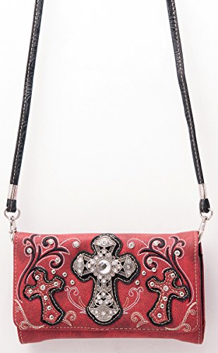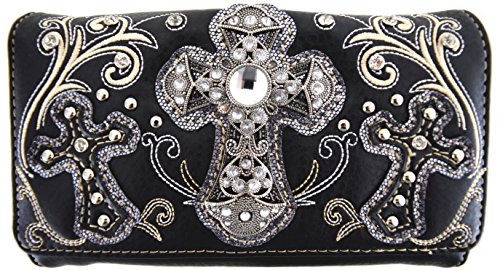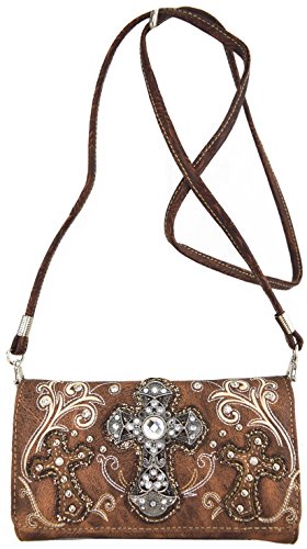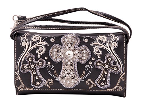 Product Description Western crossbody style wallet/wristlet/clutch is made from high quality premium faux/imitation leather with large silvertone rhinestones cross accented with cut-out crosses next to it, embroidered scroll designs, rhinestones and silvertone hardware on the front. Single, removable strap to convert the wallet into a wristlet and a single, long removable shoulder/crossbody strap. Snap closure. Flat currency compartments, expanding accordion area for coupons or receipts and a zippered pocket on the inside for coins. 9 slots on the inside for credit cards, ID, or business cards and 3 clear ID windows. Zippered and slide pocket on the back. 7.5 inches long X 1.5 inches wide X 4.5 inches tall. Aside from use as a wallet, it is great for occasions when you don't want to carry a big handbag and just want to bring the essentials so by using one of the straps you can be hands free! 0