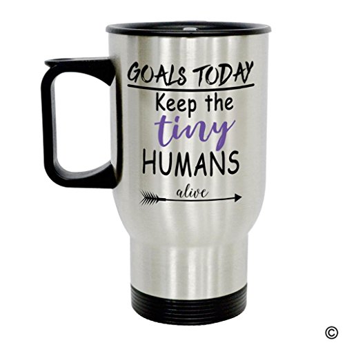 -. Feature : 14 Ounce Stainless steel travel mug with a c-shape handle / Design Concept: Goals Today Keep The Tiny Humans Alive This funny mug is designed by Linda from MsMr Studio. / The mug is in silver color. This travel mug is made of insaluted stainless steel which keep your drinks warm. It's easy to handle and dishwasher safe. The size is just good for you to use and travel. / Tangible: Please refers to the image links which we took the different angles of mugs, so the product can be more Tangible. / A Great Gift Option: This funny quotes mug is a great gift option. You can select your favourite one from various design.It's designed and made by MsMr Studio.