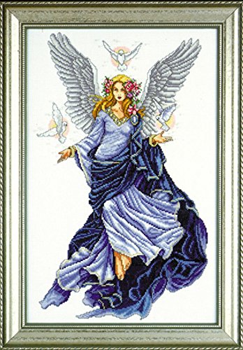 - Design Works “CELESTIAL ANGEL” counted cross stitch design (2347) features an angel, suspended in air and dressed in long, flowing light blue gown accented with a dark blue cloak; her long blonde hair is adorned with pink and lavender flowers; her outstretched hand are welcoming; this special angel is accompanied by two white doves in flight