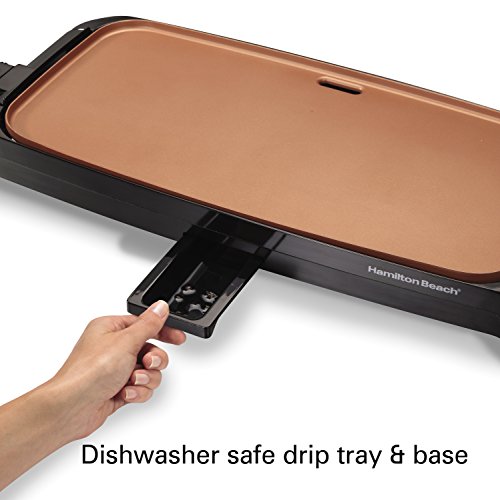 Wake your family to fluffy, golden brown pancakes made on the Hamilton Beach Duration Ceramic Griddle. Hashbrowns, eggs, sausage? It can handle it all. With its ceramic nonstick coating and 200 square inch cooking surface, you can make a whole meal with little fuss and easy cleanup. Made with Duration ceramic, this griddle provides you with superior nonstick performance that is four times more durable than traditional nonstick coatings. You won't have to scrape your meal off the cooking surface because hotcakes and fried eggs flip with ease. The heat is adjustable for a greater range of cooking options, and the handles remain cool to the touch throughout the cooking cycle. Griddles are commonly used at breakfast because they are perfect for pancakes, French toast and fried eggs, but they are flexible enough to be used all day. Try grilled cheese sandwiches for lunch and you'll be amazed at how evenly the cheese is melted and the bread browned. For dinner, make tender, juicy hamburgers and hotdogs. And the griddle is as easy to clean up as it is to use.Feature