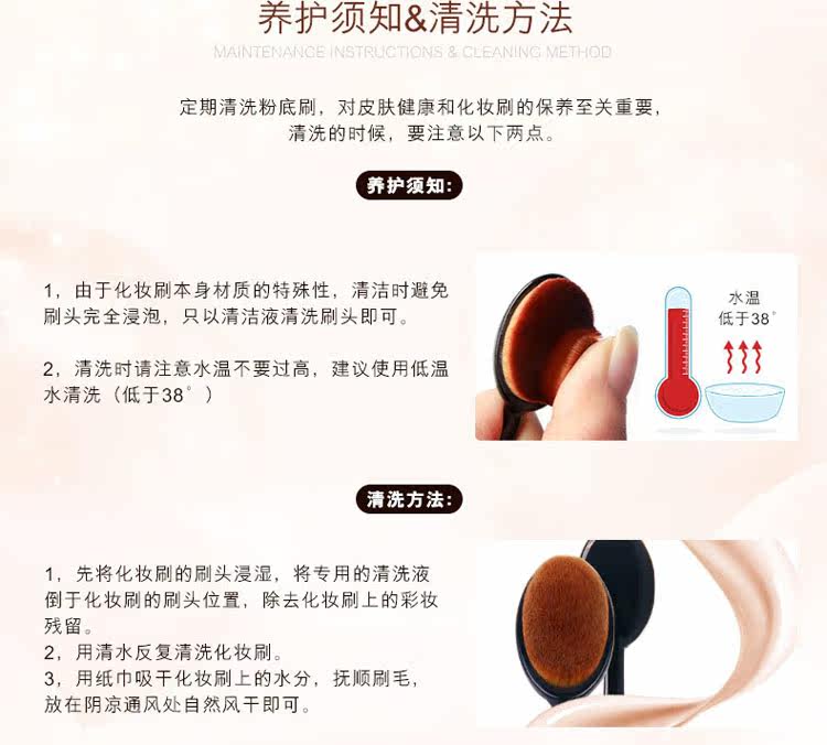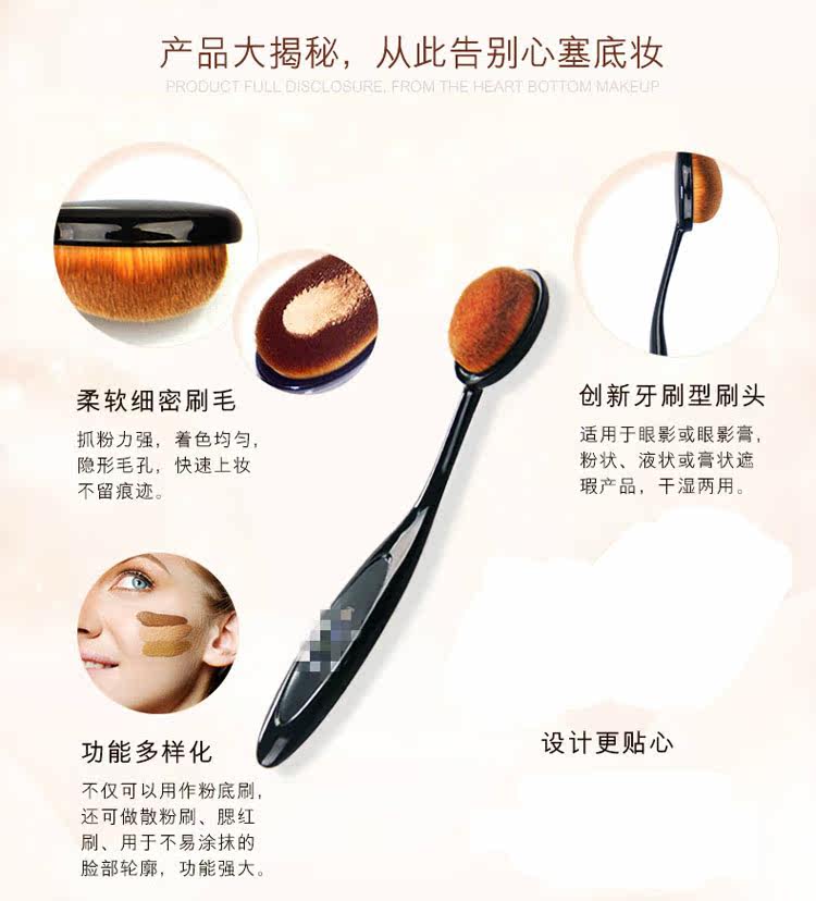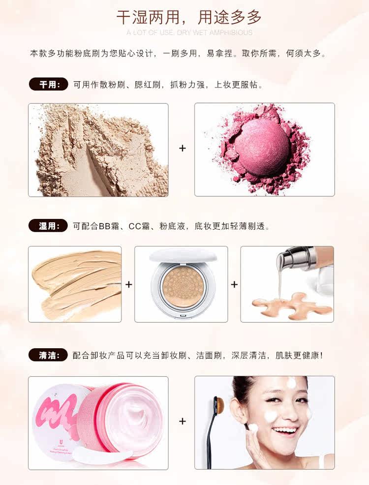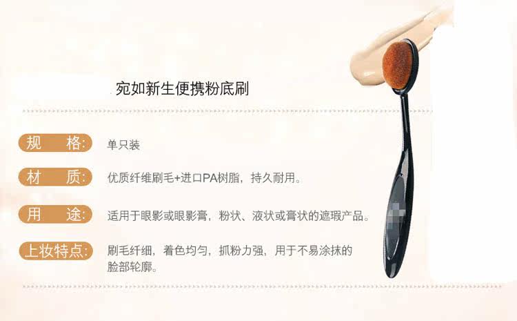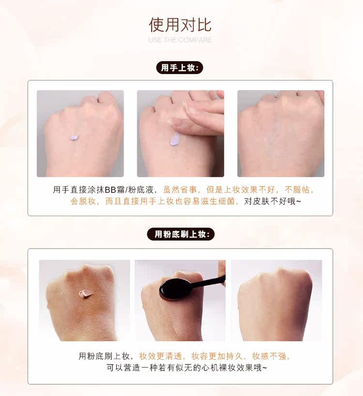 这款据说韩国是卖的红红火火的!号称是初学者必BUY的粉底刷。将粉底点在脸部,然后轻轻涂抹,粉底/bb/cc霜就会更加服帖,轻薄!!打底妆容SO EASY!不要看她便宜就理所当然觉得质量不好~~NO NO NO;那是因为我卖的便宜 !简易包装,厂家直接出货,懂不(小岳岳脸),TIAN 猫印个LOGO神马的价格立马蹭蹭蹭上去噜~~~哈哈!!!