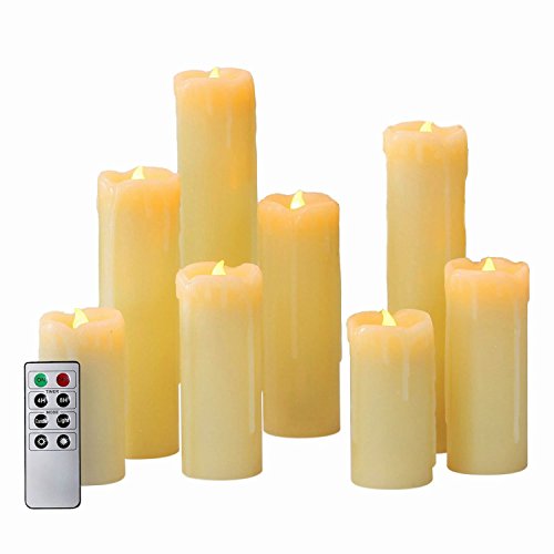 - DESCRIPTION: Set of 8 Ivory Drip Flameless Candles with an 8-function remote control. 1 bright warm white LED in each candle. All batteries included. Best for mantle display and table top decorations.