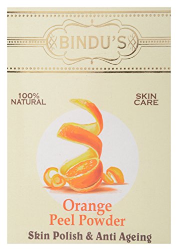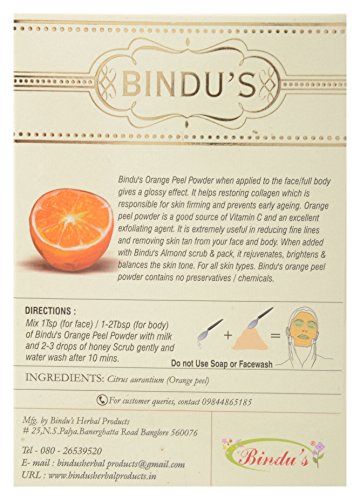Special Feature: Skin Polish + Anti Ageing - Bindu's Orange Peel Powder when applied to the face/full body gives a glossy effect. It helps restoring collagen which is responsible for skin firming and prevents early ageing. Orange peel powder is a good source of Vitamin C and an excellent exfoliating agent. It is extremely useful in reducing fine lines and removing skin tan from your face and body. When added with Bindu's Almond scrub it rejuvenates, brightens and balances the skin. For all skin types. Bindu's Orange peel powder contains no preservatives / chemicals