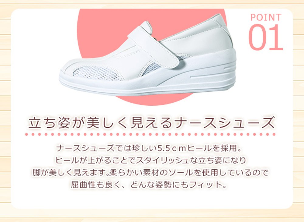 Material ● Upper: synthetic leather / double mesh (water repellent processing) ● Insole: All mesh insole (antibacterial · deodorant processing) ● Sole: EVA ● Heel height: 55 mm ● Wise: 3E ● Producing countries: China ● One foot