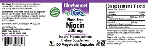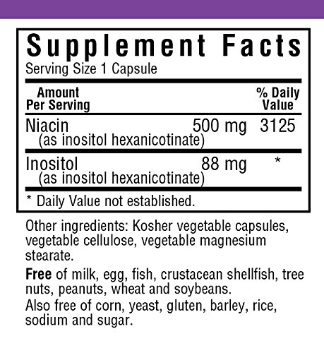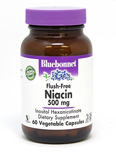 Bluebonnet's Flush-Free Niacin 500 mg vitamin capsules provide pure crystalline inositol hexanicotinate (known as flush-free niacin) in easy-to-swallow vegetable capsules for maximum assimilation and absorption. Niacin is used for treating high cholesterol. It can also be used along with other treatments for circulation problems, migraine headaches, dizziness, and to reduce diarrhea associated with cholera.Feature