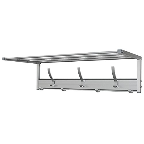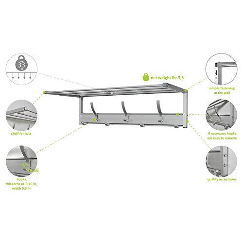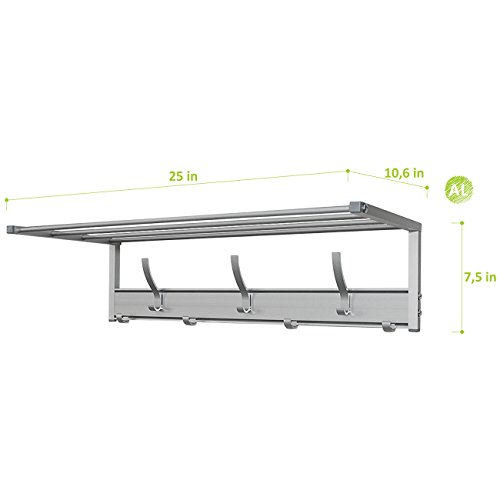 Wall Mounted Hanger Rail for Coats, Clothes, Bags | Easy to Mount Rack, Aluminum Design with Crossbar Shelf and Small & Large Hooks | 25 х 10.6 х h7.5”/ 3.4 lb Multiuse Mounted Shelf With Mobile Hooks