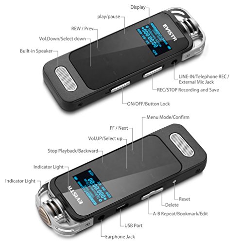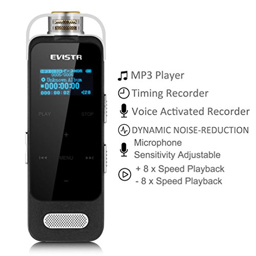 - VOICE RECORDER & MP3 PLAYER: EVISTR digital voice recorder built-in MP3 music player function, you could directly playback recorded sound on this gadget. it is a great gift for journalist, student, writer, podcast, Youtuber, Vimeo maker, Comic Dubbing, Audio blogger, anyone who need a small and clear portable voice recorder