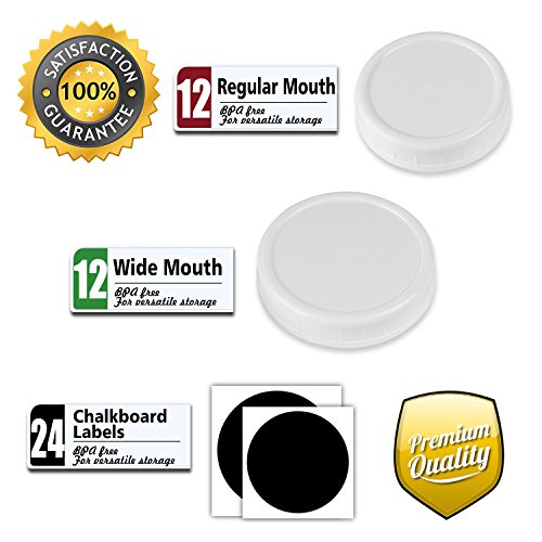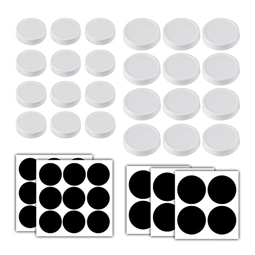Product Description Packing List: 12 x Wide Mouth Plastic Storage Caps 12 x Regular Mouth Plastic Storage Caps 12 x 2.0" in diameter Waterproof Black Vinyl Chalkboard Stickers 12 x 2.5" in diameter Waterproof Black Vinyl Chalkboard Stickers 0