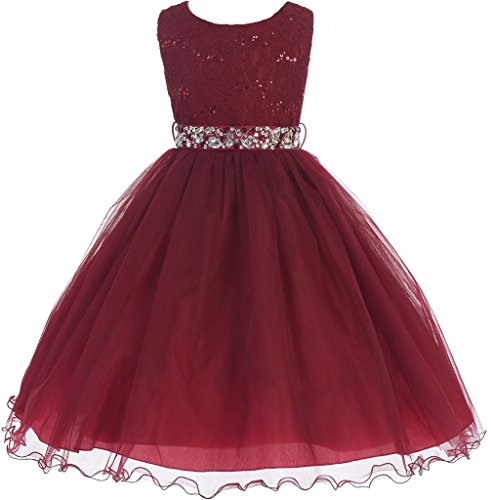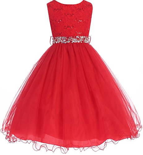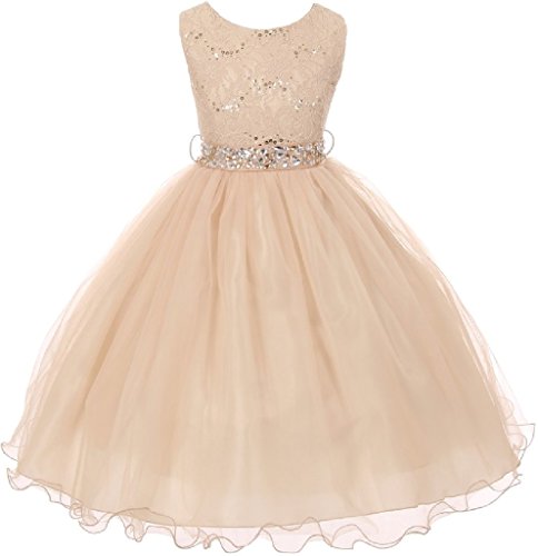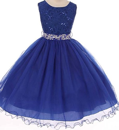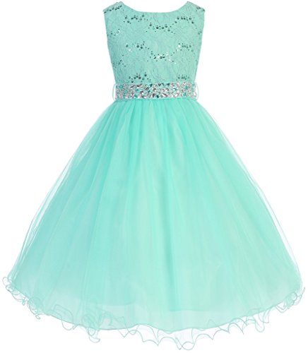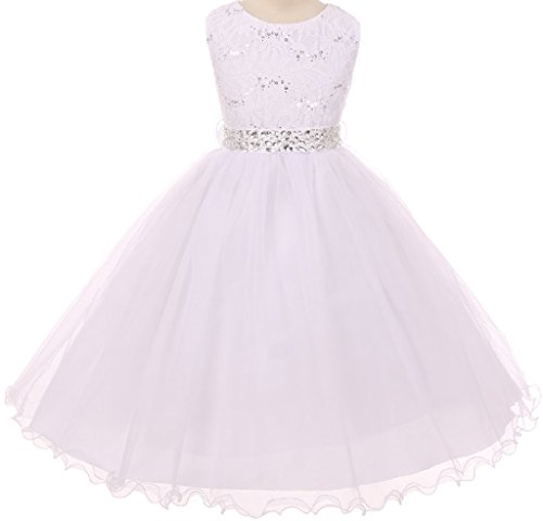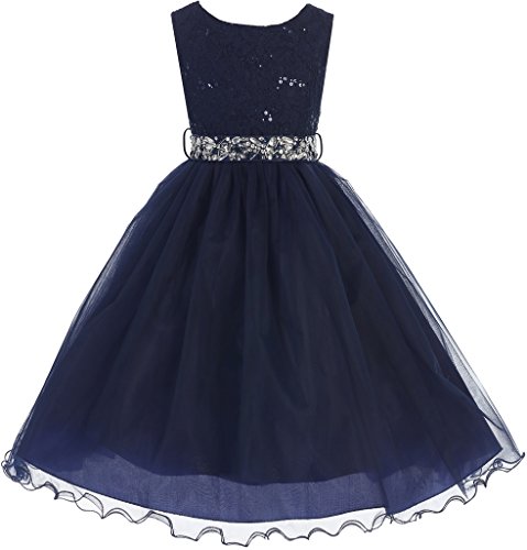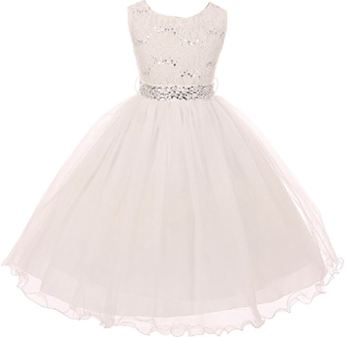 Classic Sleeveless Lace Top with Matching Sequin Detail. Tea Length Skirt has two layers of Tulle and is lined with an additional layer of net for Fullness. Comes with matching, detachable Rhinestone Belt. Perfect for flower girl, junior bridesmaid, Easter, pageant, graduation and other special occasions.Feature