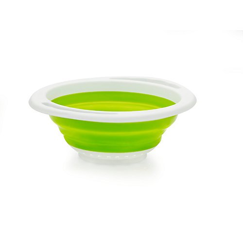 - Circular colander adds a touch of color with a simple green and white design
