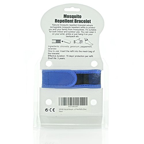 -. Binding : Lawn & Patio -. Brand : SKRABI -. Color : Blue -. EAN : 0646816953651 -. Feature : Mosquito free summer: enjoy your summer vacation, your outdoor walks and your camping trip without annoying mosquito buzzing / Smart design, 2 film refills: our mosquito repellent comes in the form of a bracelet for your wrist, smartly prohibiting any trace of the repellent / Safe, deet-free composition: avoiding any dangerous chemicals and toxic substances like deet, skrabi has devised a product of natural repellents / Easy, adjustable fit: due to its velcro strips, you can wear our bracelet on your wrist, your ankle or even attach it on your belt or backpack -. HazardousMaterialType : Unknown -. Label : SKRABI -. Manufacturer : SKRABI -. Model : RBBVE -. MPN : RBBVE -. PackageQuantity : 1 -. PartNumber : RBBVE -. ProductGroup : Lawn & Patio -. ProductTypeName : OUTDOOR_LIVING -. Publisher : SKRABI -. Size : Universal -. Studio : SKRABI -. Title : SKRABI Top Mosquito Repellent Bracelet, Complete Protection from Mosquito Bites, Natural Lemon and Eucalyptus Ingredients, Long Lasting Effect, 2 Film Refills, Comfortable and Stylish -. UPC : 646816953651