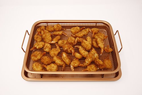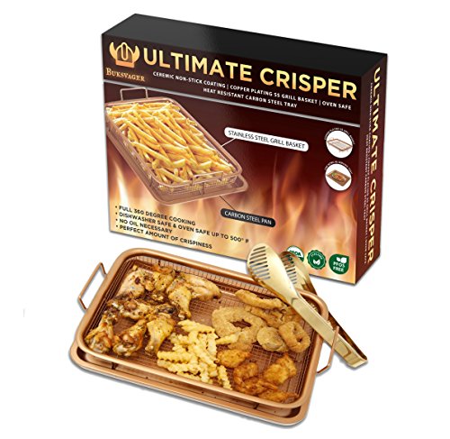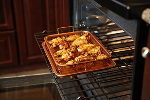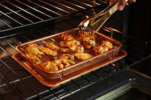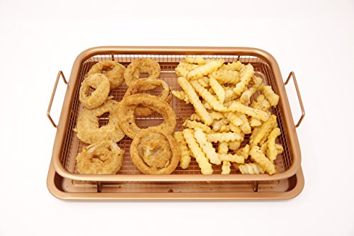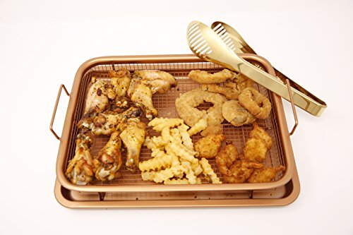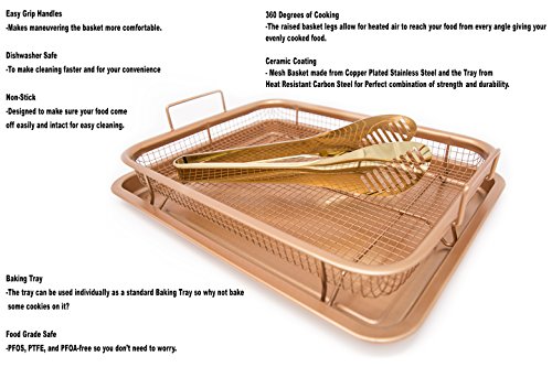 Included with the Ultimate Crisper: 1 x Grill Basket. Measuring 8.9" X 11.9" 1 x Baking Tray. Measuring 9.6" X 12.8" 1 x Premium Gold Tongs 1 x Recipe ebook •Suitable for use in any fan or gas oven or grill withstanding temperatures up to 550°F •Heat resistant coating is 100% PFOS, PTFE and PFOA-free. No need to worry about unhealthy additives. •Raised grill basket allows heat to circulate perfectly around your food, ensuring it cooks evenly while producing crispy results at the same time, every time without burning! •No need to flip, turn or rotate your food. The Ultimate Crisper design does all of this for you! •Non-stick, oil free coating makes for easy clean up AND healthier option. •Bottom tray catches grease, crumbs, and other food debris. Can also be used as a normal baking tray, for cookies and other holiday treats! •Suitable for use in any fan or gas oven or grill withstanding temperatures up to 550°F •Heat resistant coating is 100% PFOS, PTFE and PFOA-free. No need to worry about unhealthy additives.Feature