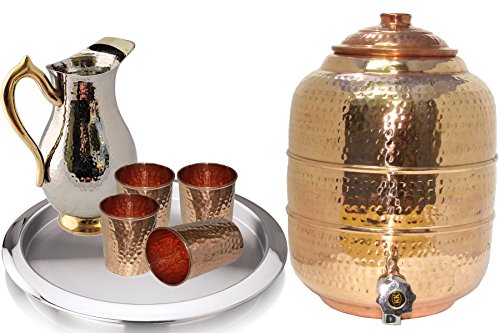-. Title : King International Copper Water Tank,4 Copper Hammered Glasses & 1 Copper & Steel Jug And 1 Steel Tray,Set Of 7 Pieces