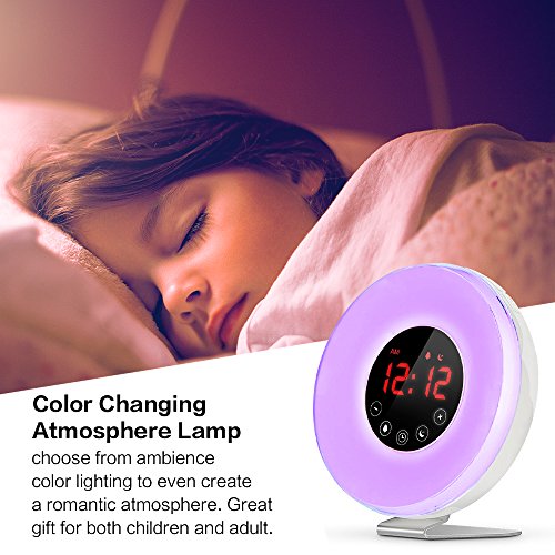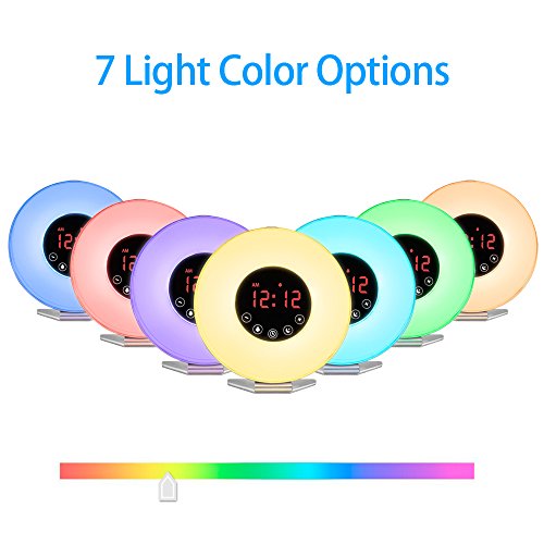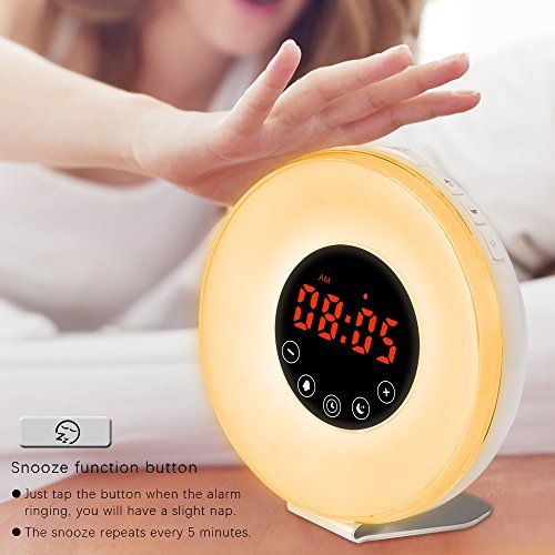 2017 Upgraded wake up light with Snooze function and 6 alarm sounds:When the sound plays, press "snooze" to get 5 more minutes' sleep. When the alarm sounds again, it will last 5 minutes. There are 6 unique alarm sounds to choose from Ocean wave, nature sounds, crickets, barnyard sounds, bubbling brook and birds singing.