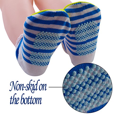 PROTECT YOUR BABY! These socks are perfect for the fussy baby that kicks off their socks! They are great socks that allow plenty of room to grow into, anti-slip bottom prevent fall down for your toddler from smooth wood floors. They are just adorable and the white-dotted skid proof bottoms to make them great for baby feet and start to walk. If you are looking for a baby gift or have a toddler of your own, this pack is great because of the variety of colors and patterns and the light breathable material. They are easy to get on and older toddlers are probably big enough to dress their little feet all by themselves, helping Mom out. Great for all surfaces - indoors, outdoors, wood floors, playground, day care and play areas. Super cute design, machine washable, will not fade and shrink when machine washed. 0