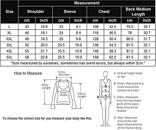 US XXL=Shoulder:19.1"-Sleeve:9.8"-Chest:49.9"-Back Medium Length:31.4"