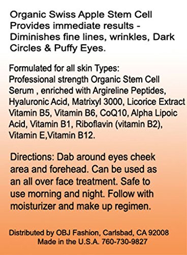 -. Feature : PREMIUM QUALITY PROVEN EFFECTIVE: This Stem Cell base eye gel treatment gives immediate results: More Radiant and Younger-Looking Eyes. MICHELE OBAMA, Jennifer Lopez & Helen Mirren all use Swiss Apple Stem Cell Eye Gel. / Diminish Dark Circles & Puffiness - Award winning Formula designed for the delicate skin around your eyes to reverse the signs of aging, fade dark circles under eyes and puffy eyes by draining excess fluids. Plant-derived peptide serum extracted from Swiss apple stem cells with clinically proven anti-wrinkle efficacy and free radical scavenging properties. / Hydrates and Firms Skin: This eye gel serum treatment keeps eye area hydrated & healthy looking; formula contains ingredients for best results; Swiss Apple Stem Cells enhance its strength to protect against sun damage and other external factors while Hyaluronic Acid hydrates the skin and plumps it up with moisture; The Matrixyl 3000 helps to firm the skin. / Safe For All Skin types: Does not contain parabens, sulfates or alcohol; It is safe to use on ALL skin types; This eye gel serum Treatment has better and faster absorbent properties; For best results use twice a day in order to restore your skin back to its natural youthful glow and reverse the signs of aging / MANUFACTURERS GOLD-STANDARD GUARANTEE - All products come with Our 100% Gold-Standard, Unconditional, 90-Day Money-Back Guarantee. No Questions Asked
