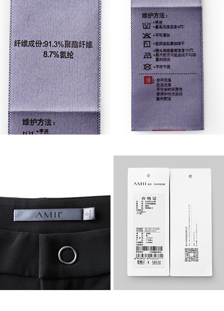 | 洗涤标准: | 悬挂晾干不可干洗不可漂白不可浸泡110℃以下垫布熨烫40℃以下手洗 |