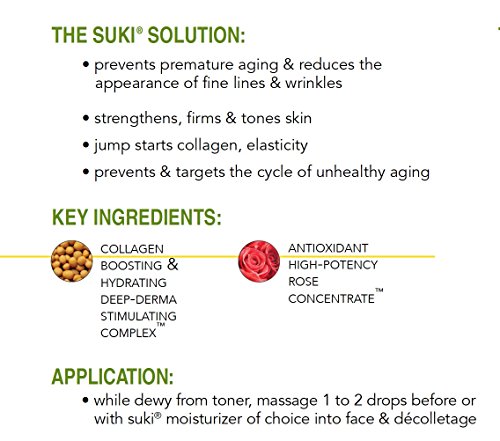 THE SUKI DIFFERENCE: DEEP-DERMA STIMULATING COMPLEX: Suki Proprietary Complexes Combine High-Performance Ingredients To Target Issues Safely & Effectively. Contains Our SSS Technology - The Advanced Delivery Method Of This Powerful Antioxidant, SSS Vitamin C, In Our Uniquely, "Safe For Sensitivities" Format - No Caustic, "VSA" (Volatile Synthetic Active) Side Effects - Peeling, Irritation Or Inflammation. Also Contains Our Advanced Collagen Extract. Maintains Healthy, Strong & Vibrant Skin Tone HIGH-POTENCY ROSE CONCENTRATE: Made Here On Site, From Organic Roses, Triple-Filtered & Extracted For Extra Potency.Vitamin-Packed, Antioxidant-Rich Botanical Base Used In All Our Hydrous Products. Matches Skin's Chemistry & PH Enables The Integration Of All Our Products & Proper Derma Penetration. Creates Overall Balance & Radiant Skin Tone. No Synthetic Allergens, Parabens, Phthalates, Petrochemicals, Synthetic Fragrances / Dyes Or Sulfates. Appropriate For Even The Most Sensitive Skin Types; Tested Safe For Pregnant Women, Nursing Moms & Babies.Feature