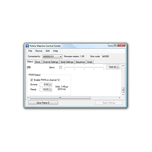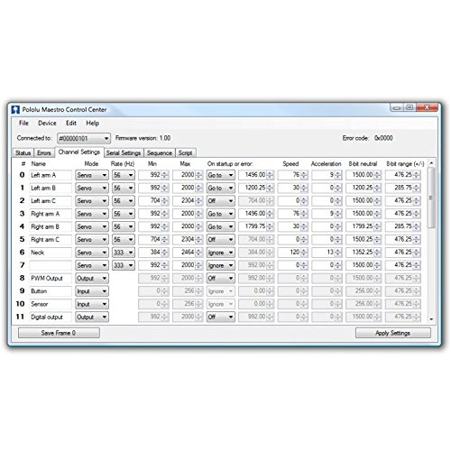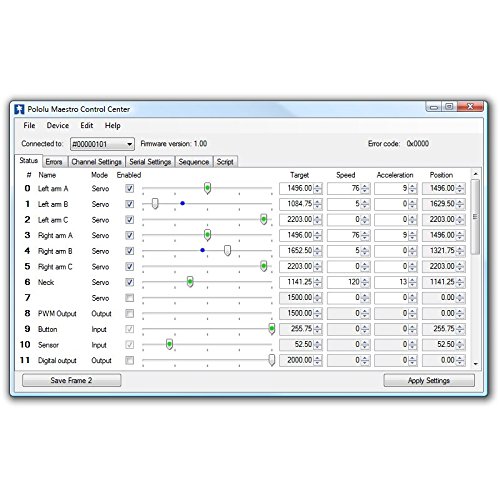 A free configuration and control program is available for Windows and Linux, making it simple to configure and test the device over USB, create sequences of servo movements for animatronics or walking robots, and write, step through, and run scripts stored in the servo controller.
