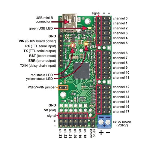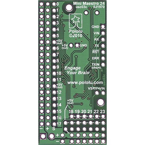 Because the Mini Maestro’s channels can also be used as general-purpose digital outputs and analog or digital inputs, they provide an easy way to read sensors and control peripherals directly from a PC over USB, and these channels can be used with the scripting system to enable creation of self-contained animatronic displays that respond to external stimuli and trigger additional events beyond just moving servos.