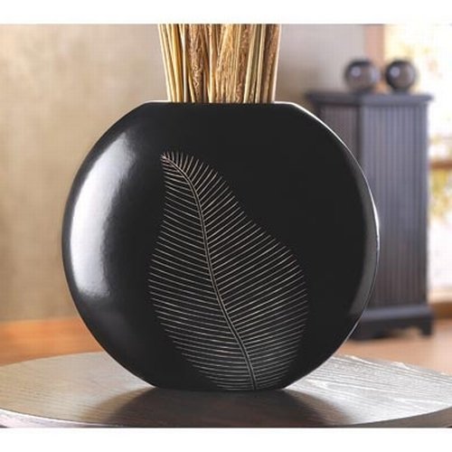 Simple and striking, this circular wooden vase serves beautifully as a handsome backdrop for a grouping smaller objects, or on its own as a dramatic focal point. Graceful carved leaf adds natural appeal. Decorative purposes only. MDF wood. 13-Inch by 4-inch by 11-1/2-inch high.Feature