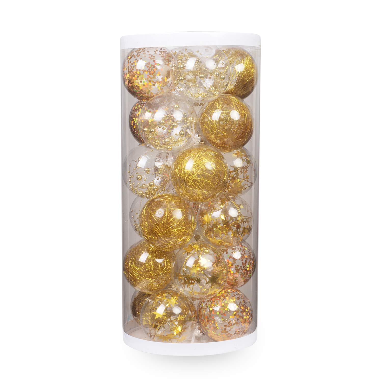 【パッケージ内容】ボール装飾品24個セット 【本体サイズと素材】(約):直径8cm 素材:プラスチック 【カラーと図柄】4柄×各6個 (ひも付き)カラー:透明ボール,ボール内部にゴールド飾り 【商品の梱包】配送により破损を防ぐため、改善した包装は以前より10倍の厚さでもっと丈夫で輸送トラブルを减らできます。また缲り返し利用もできます。外侧の包装に「Open Here」と字で目立つように书かれていた。 【聖なる夜を楽しむ】高級感のある透明タイプ、より一層華やかにしてくれるオーナメントボールです!。好きな色を組みあわせて、可愛らしいデザインが楽しい雰囲気を演出し、クリスマスを一層華やかにします。