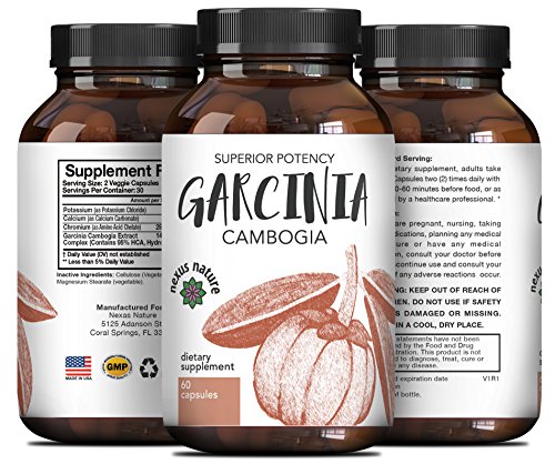 -. Binding : Health and Beauty -. Brand : Nexus Nature -. EAN : 0806808279781 -. Feature : GARCINIA CAMBOGIA contains 95% HCA which supports appetite control. Pre workout supplements for increased energy & better exercises. Wellness complex infused with vitamin C promotes burning calories & fat. / GARCINIA CAMBOGIA EXTRACT fast acting weight loss capsules are great to combine with detox & cleanse. Pure supplement rich in antioxidants & great for maintaining optimal health. / GARCINIA CAMBOGIA VITAMINS 95% HCA weight loss complex. Best pills for increased metabolism & promotes good mood. Extra strength capsules boost serotonin levels lift spirits & reduce cravings. / ALL NATURAL WEIGHT LOSS with Garcinia Cambogia appetite suppressant supplements. Reduces cravings & binge eating. Premium quality fast & effective pills promote clean eating & healthy weight loss. / MONEY BACK GUARANTEE Garcinia Cambogia high quality supplements are easy to swallow & absorb rapidly. Effective dietary pills go beyond weight loss & suppressing appetite, also maintain general health -. IsAdultProduct : 0 -. Label : Nexus Nature -. Manufacturer : Nexus Nature -. MPN : LE -. PackageQuantity : 1 -. PartNumber : LE -. ProductGroup : Health and Beauty -. ProductTypeName : HEALTH_PERSONAL_CARE -. Publisher : Nexus Nature -. Studio : Nexus Nature -. Title : Best Garcinia Cambogia 95% HCA Weight Loss Vitamins - Fast Acting Fat Burn Supplements for Men & Women - Natural Appetite Suppressant Capsules - High Quality Capsules Boost Energy - By Nexus Nature -. UPC : 806808279781