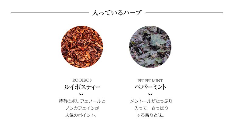 | 産地 | ルイボスティー:南アフリカ共和国 ペパーミント:オーストリア ※時期やロットよって変更する場合がございます。 | 味の特徴 |