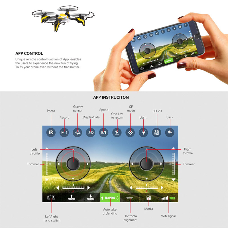 Function: Forward/backward, up/down, left/right, sideward flight, hovering, 3D-flip, headless mode, one-key return, H/L speed, camera, APP control, LED lights