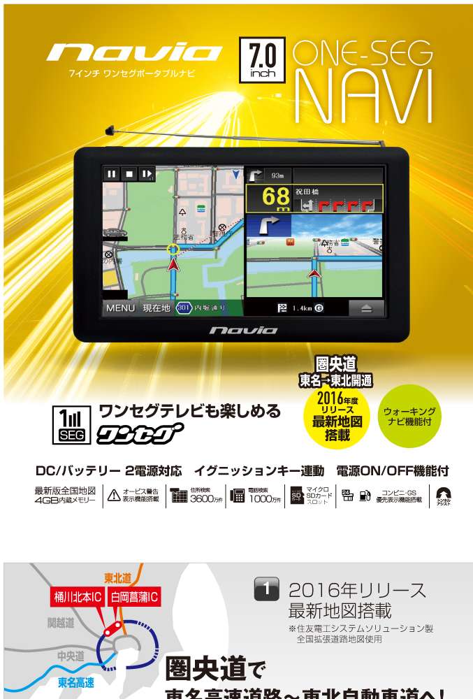 ●ワンセグテレビも楽しめる、7インチポータブルナビ