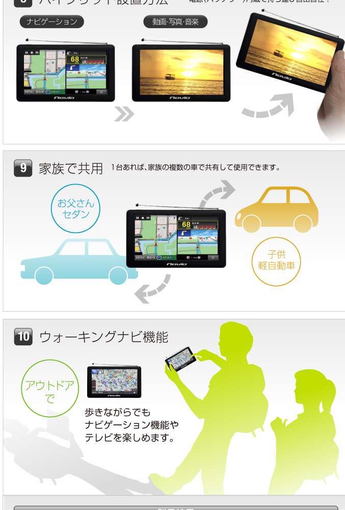 ●付属品:車載用吸盤スタンド一式、スタイラスペン(スタンドに付属)、車載用DCアダプター(入力:DC12-24V)、吸盤ベース板、取扱説明書、保証書