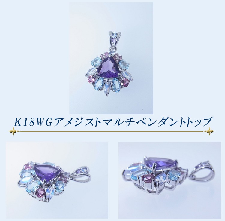 商品説明 1.25ctアメジストを中心にムーンストーン、ガーネット、アクアマリンが輝きを添えたK18ホワイトゴールドのマルチペンダントトップです。