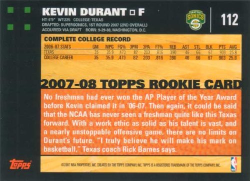 Kevin Durant 2007 2008 Topps Mint Condition Rookie Year Card #112 Picturing This Oklahoma City Thunder Star in His Seattle Supersonics Jersey!