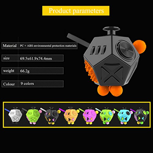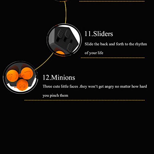 Fidget Dodecagon has 12 sides with each side featuring something different to fidget with: 1.) Gear - Three gears which can be rolled back and forth 2.) Rotating Disk - A circular dial which can be clicked and turned in any direction 3.) Buttons - Buttons replicating a gaming controller 4.) Silicone ball - Soft, elastic silicone ball can be pulled and pinched 5.) Switch - On/off switch which pivots back and forth 6.) Joystick - Gaming joystick which allows for 360° rotation 7.) Silicone rope - Allows you to hang your Fidget Dodecagon wherever you please 8.) Soft button - Button replicates the feeling of clicking a pen 9.) Finger Massage - The soft tactility of the surface has the function of improving blood circulation 10.) Worry Stone - Modeled after an ancient tool for anxiety relief, rub it repeatedly to relieve stress 11.) Sliders - Slide them back and forth to the rhythm of your life 12.) Minions - Three cute little faces, they won't get angry no matter how hard you pinch them Work - School - Home Our Focus Cube fidget toy is designed to bring anywhere you go. Our silent features make it easier to use in quite area such class rooms, at home, and at the workplace.