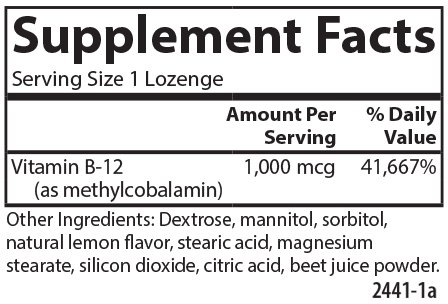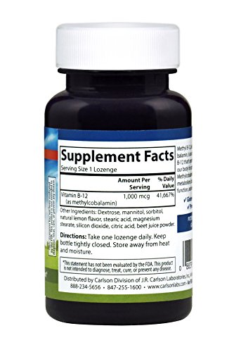 ReleaseDate : 2016-12-27 Studio : Carlson Labs Publisher : Carlson Labs Binding : Health and Beauty Product Description Carlson Labs' Methyl B-12 is a unique and powerful supplement that provides 1,000mcg of vitamin B-12 per lozenge. B-12 promotes healthy energy metabolism, and supports healthy brain and nerve function. It also promotes healthy red blood cell formation, and Carlson's formula is optimal for faster absorption, which means faster effects. 0