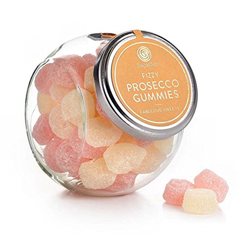 -. Feature : Fruity gummy sweets with a delicious taste of sparkling Prosecco / Infused with real Prosecco / Sugar crystals add a fizz and a sparkle / Presented in a glass sweet jar / Non alcoholic, Gluten free, Contains only natural colours and flavours