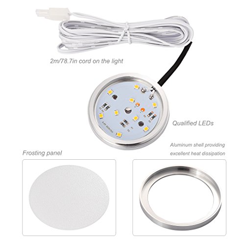 Each panel light has 2 watts 170lm output, sufficient bright for your cabinet, 3 puck lights kit for 510lm, 6 puck lights kit for 1020lm, 90% energy saving and 50000 hours long lifespan will save your more money.