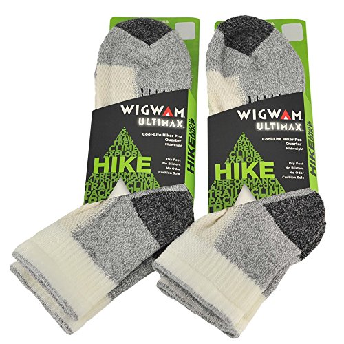 -. Brand : Wigwam -. Department : unisex-child -. Feature : Made in US / Machine Wash / 62% Coolmax Polyester, 21% Stretch Nylon, 9% Cotton, 8% X2O Acrylic / Seamless toe seam and mid-weight construction make this the perfect sock for all outdoor activities -. Model : Cool-Lite Hiker Pro Qtr 2-Pack -. ProductGroup : Apparel -. ProductTypeName : OUTDOOR_RECREATION_PRODUCT -. Title : Wigwam Ultimax Unixex Cool-Lite Hiker Pro Quarter Midweight Socks Bundle