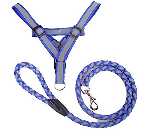Dog Reflective Rope with Polyester Harness Strap Vest Collar Leashes For Night Walking Description: Material:Polyester .Solid and Durable.Wear Comfortable for Your Dog Color:Black.Blue Size: M:47.24' long round rope chain, 0.78' wide and 12.59'-18.89' adjustable shoulder straps L:47.24' long round rope chain,0.98'wide and 14.14'-21.65'adjustable shoulder straps Easy to Take On and Off the Leash Handle and Harness Suit for Your Dog Walking,Hunting In the Evening Adjustable Strap Allows for Comfortable Seating and Standing Package Include : 1*Dog Leash Harness 0