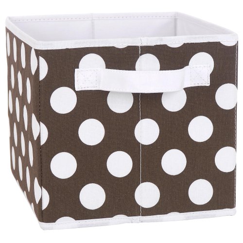 - Foldable sage-colored bin with white polka dots coordinates with many nurseries