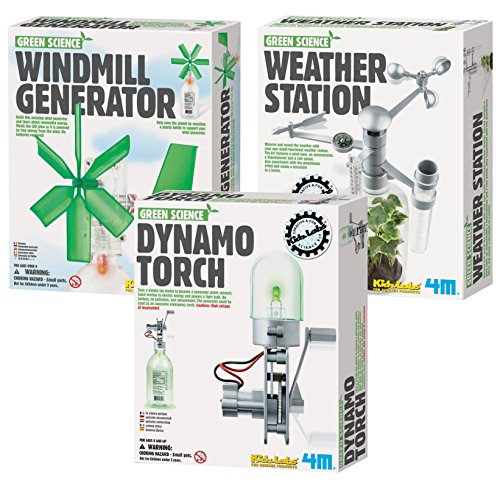 -. Binding : Toy -. Brand : 4M -. EAN : 0702658081157 -. Feature : Build this 5" wind generator, all you need is a plastic bottle / Learn about renewable energy with our enclosed fun facts pamphlet / Learn about your climate while tracking weather changes and conducting experiments on the greenhouse effect / Completed station measures 8.5"X4.75"; Just add your own bottle to create a functional weather station / Turn a simple toy motor into a generator; The generator could be used as an awesome energy torch -. Label : Toysmith -. Manufacturer : Toysmith -. PackageQuantity : 4 -. ProductGroup : Toy -. ProductTypeName : TOYS_AND_GAMES -. Publisher : Toysmith -. Studio : Toysmith -. Title : 4M Green Science Windmill Generator with Weather Station & Dynamo Torch -. UPC : 702658081157